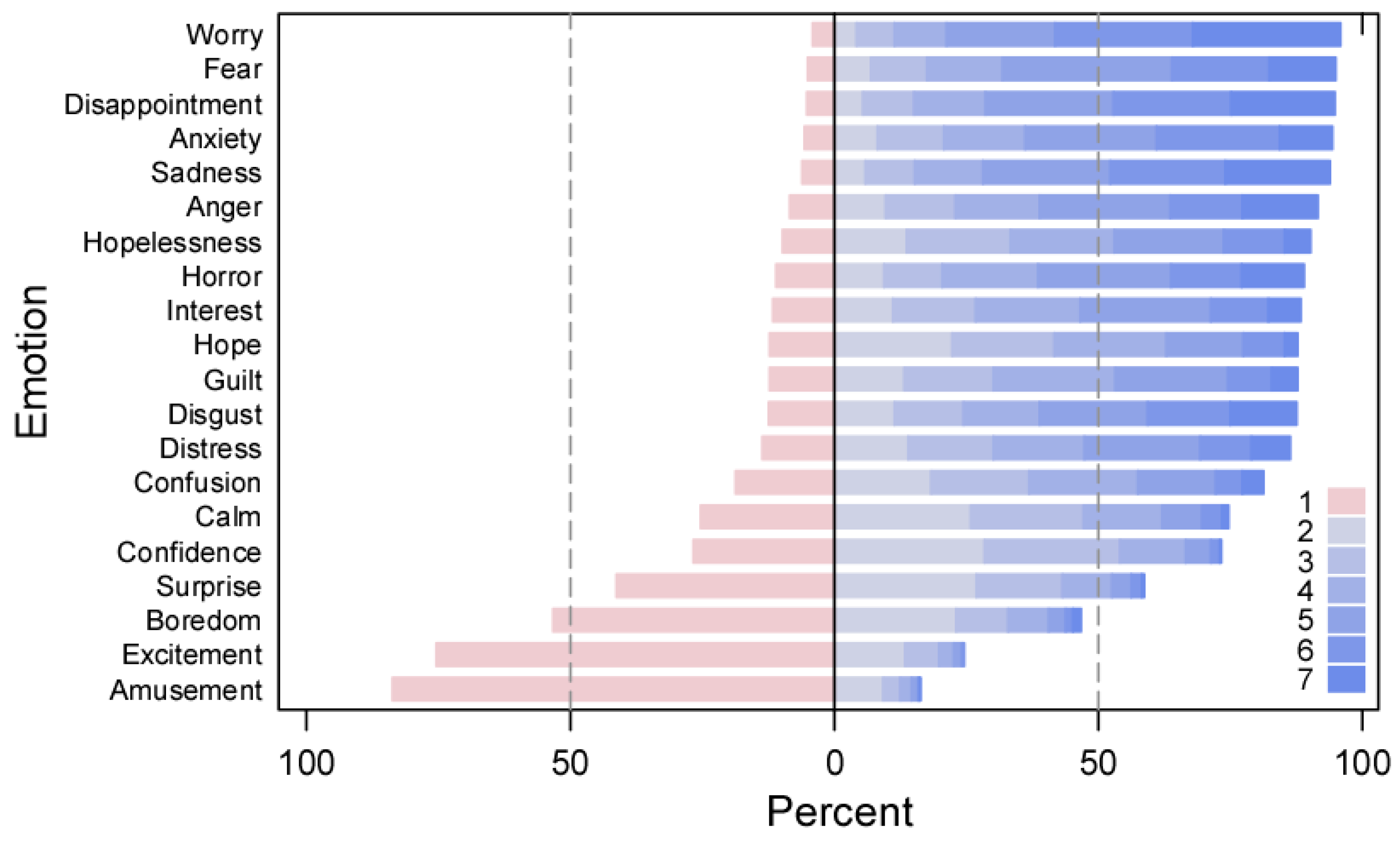 Figure 2. Frequency distribution of emotion intensity when thinking about climate change. The left side of the graph shows the percentage of participants who selected 1 (“Not at all”) for how much they felt each emotion. The right side of the graph shows the stacked percentages of participants who identified that they felt an emotion to some degree by selecting 2–7, where 7 was labelled “Very strongly”. See Supplemental Material S4 Figures S3 and S4 for results separated by survey.