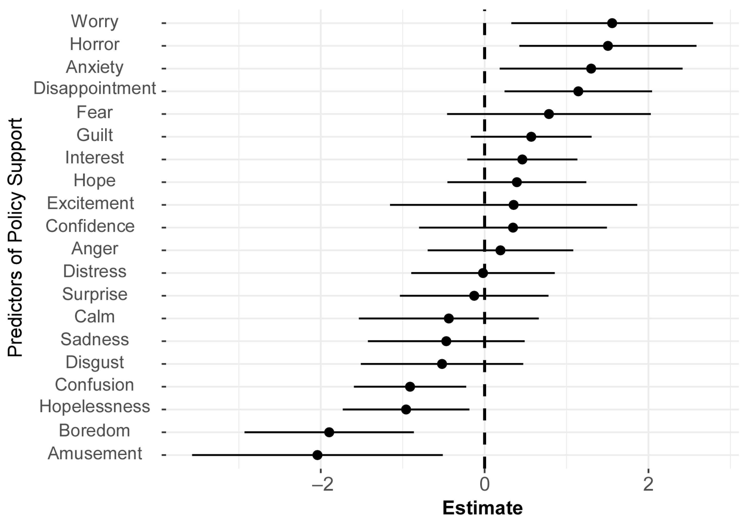 Our analyses identified three emotions that were most robustly predictive of policy support in the merged sample: worry, horror, and boredom. As expected, we find unambiguous emotions (worry, horror and boredom) to be strongly associated with environmental policy support. Below, we interpret these findings with reference to theory and prior empirical work.