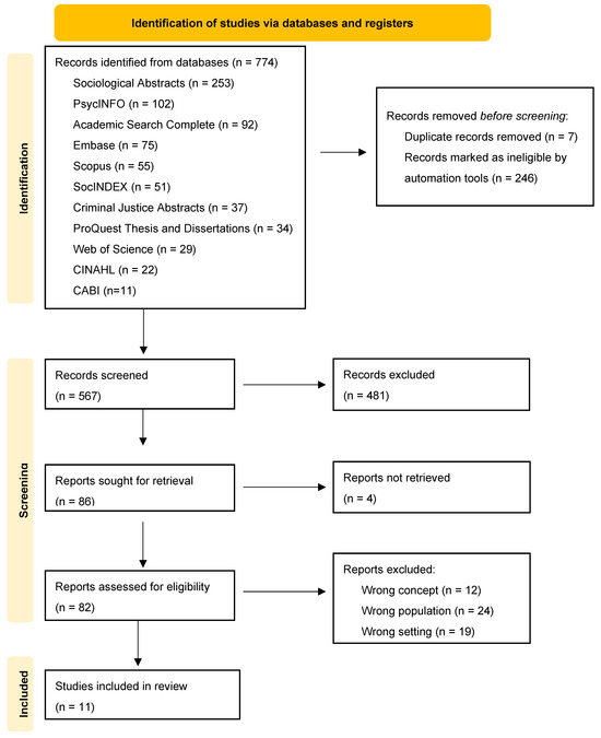 A total of 774 records were identified from the included databases and an additional 46 from grey literature sources and hand searching (820 in total). All records were imported into Covidence where duplicates were removed, leaving 567 records remaining. Four records were excluded because full text could not be obtained. After titles and abstracts were screened for relevance, 86 records were identified that met the inclusion criteria, and these were subjected to a review of the full text. Ultimately, 71 reports were excluded leaving 11 studies for inclusion in this review.