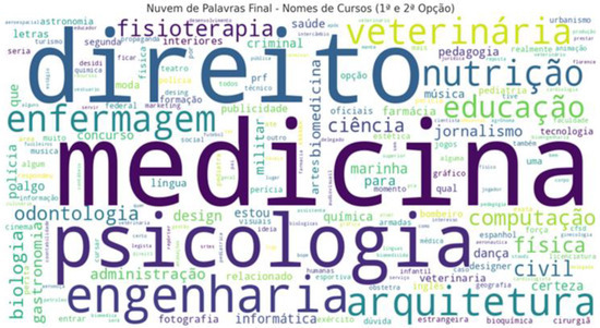 Regarding the procedures applied to the open-ended variable on the intended study programme, the responses ‘Don’t know’ (f = 31), ‘No answer’ (f = 5), and ‘CFO’ (f = 51) were disregarded. The ‘Don’t know’ responses (f = 31), however, were subjected to a dedicated analysis. ‘CFO’ refers to the Officers’ Training Course; since Rebeca Simões School is a military institution, there is a strong tendency for students to choose this pathway. Although relevant, as highlighted in the literature (Força Meninas 2023), the authors have considered it a bias in the context of this research and therefore excluded those responses. This process resulted in 385 valid answers, which were subsequently categorised into the educational areas defined by UNESCO (2014) for the Brazilian context.