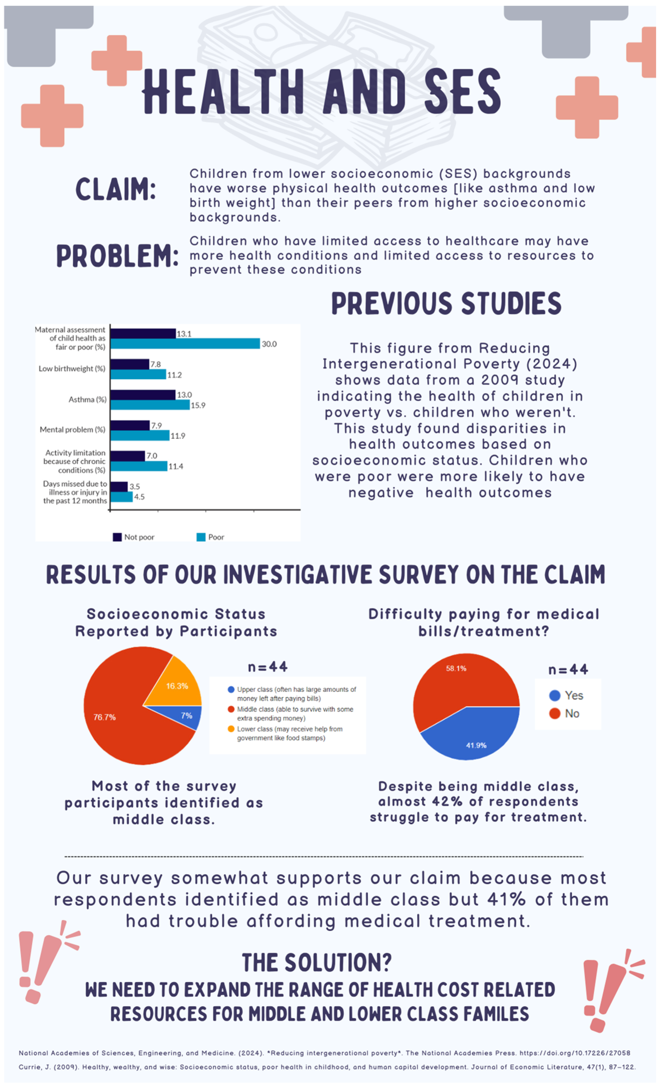 | 2 | Health and Socioeconomic Status | Explores disparities in physical health outcomes between low and high SES children through a survey (N = 44). | Findings suggest that participants from both middle and low SES backgrounds struggled to afford medical treatment. | Expand the range of healthcare cost related resources for middle- and lower-class families to improve healthcare access. | Economic Stability | Community |