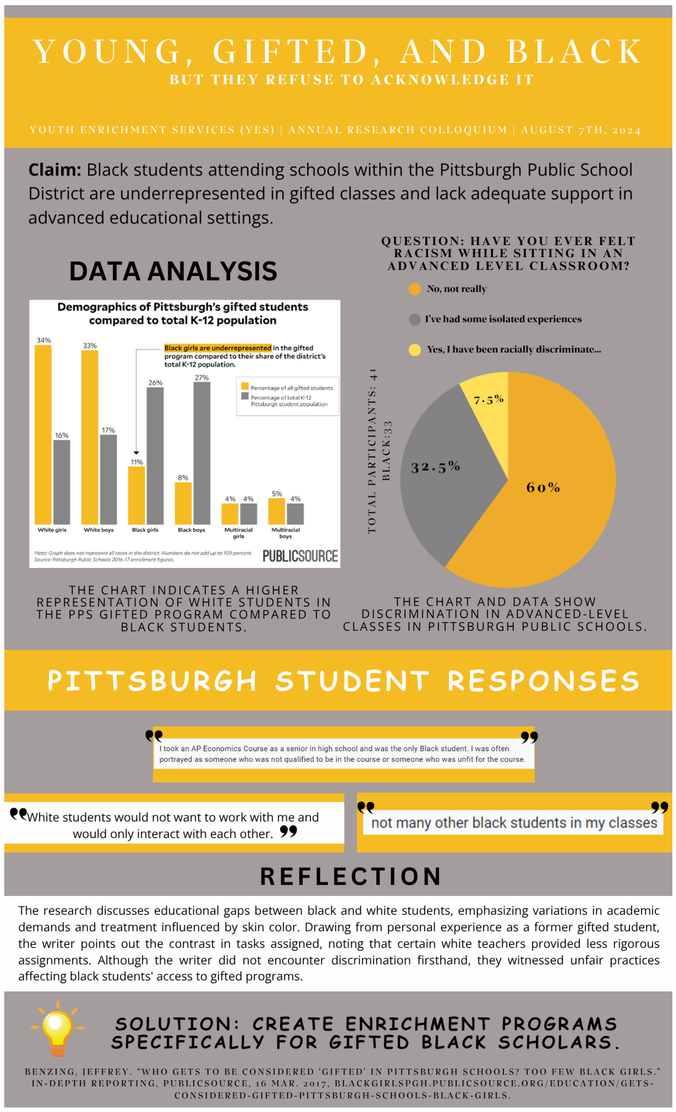 | 5 | Young, Gifted, and Black | Explores inequitable access to advanced education opportunities for black youth through a survey (N = 41). | Findings suggest that Black students are underrepresented in gifted classes, lack adequate support in advanced educational settings, and are intentionally given less challenging tasks. | Offer enrichment programs in public schools tailored to the needs of gifted Black scholars to improve access to advanced education. | Education Access and Quality | Institutional |