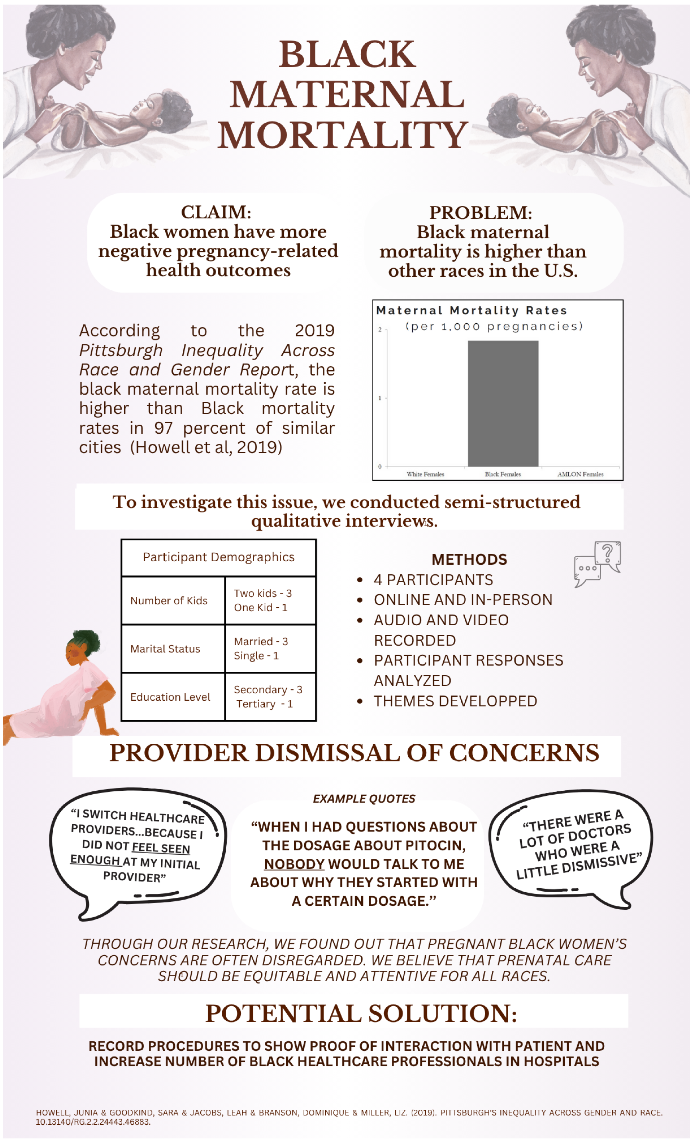| 10 | Black Maternal Mortality | Explores healthcare quality and negative pregnancy-related outcomes in Black women through semi-structured interviews (N = 4). | Findings suggest that pregnant Black women’s concerns are frequently disregarded by healthcare professionals. | Record patient-provider interactions and increase the number of Black healthcare professionals to improve pregnancy-related outcomes for Black women. | Healthcare Access and Quality | Multilevel (Interpersonal, Institutional) |