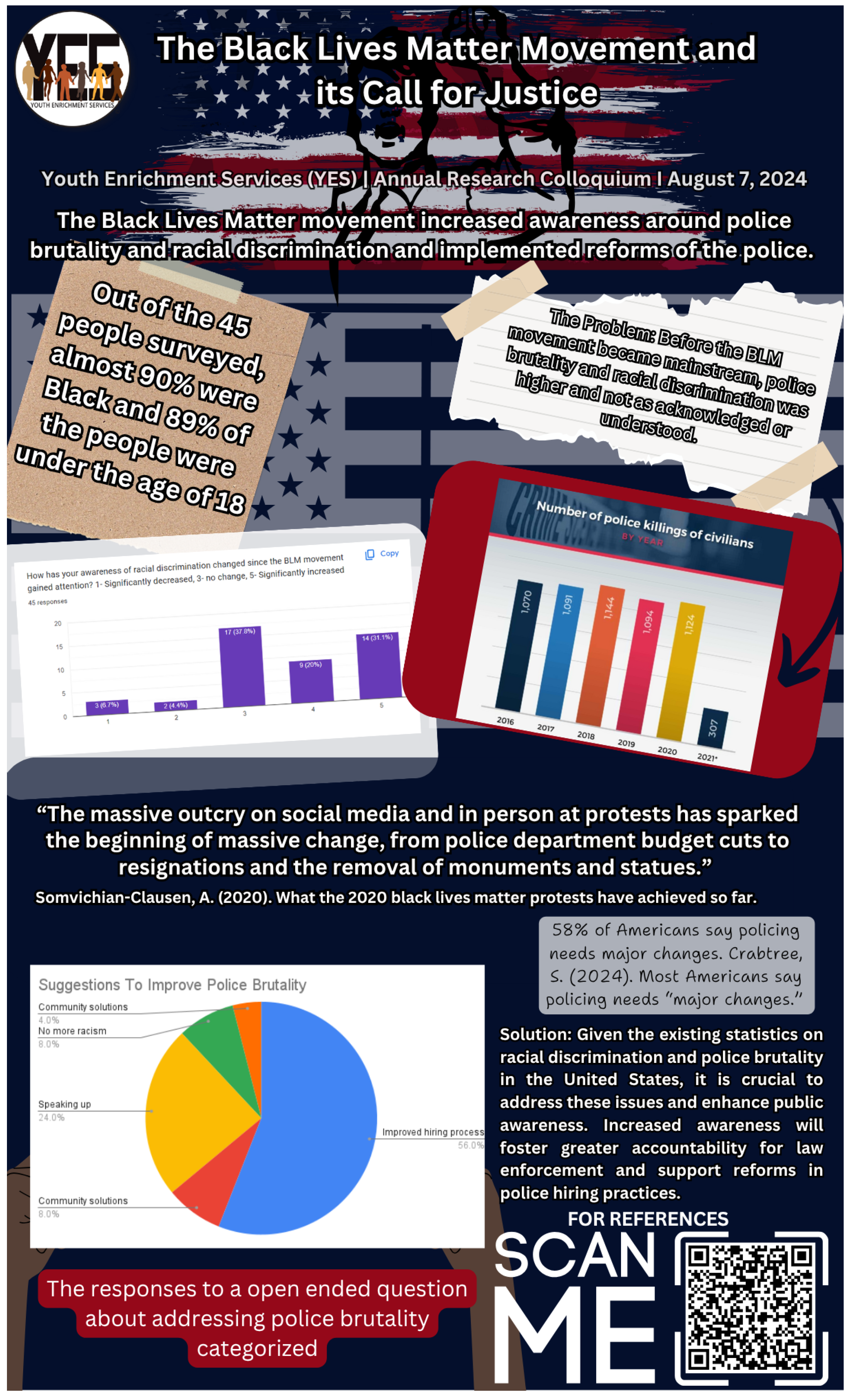 | 23 | Black Lives Matter Movement | Explores the positive effects of the Black Lives Matter movement, including increased awareness of police brutality and police reforms through a survey (N = 45). | The findings suggest that participants’ awareness of police brutality and discrimination increased following the Black Lives Matter movement, and most believe that the best way to address police brutality is through improving hiring practices. | Increase awareness to foster greater accountability for law enforcement and support reforms in police hiring practices. | Social and Community Context | Multilevel |