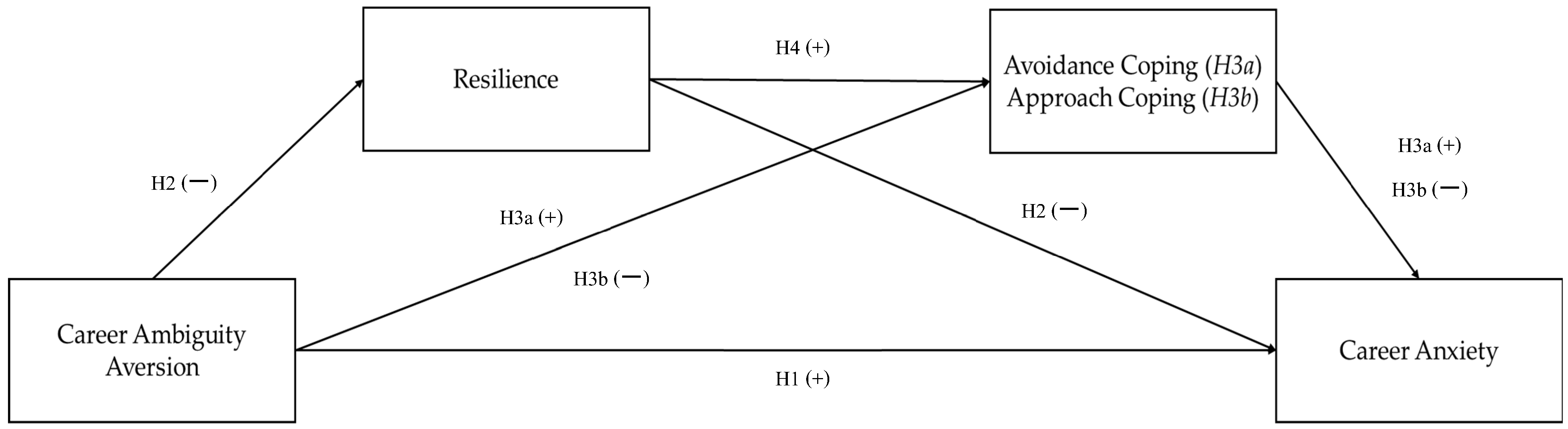 Career ambiguity aversion is expected to negatively relate to approach coping, which, in turn, is expected to negatively relate to career anxiety.