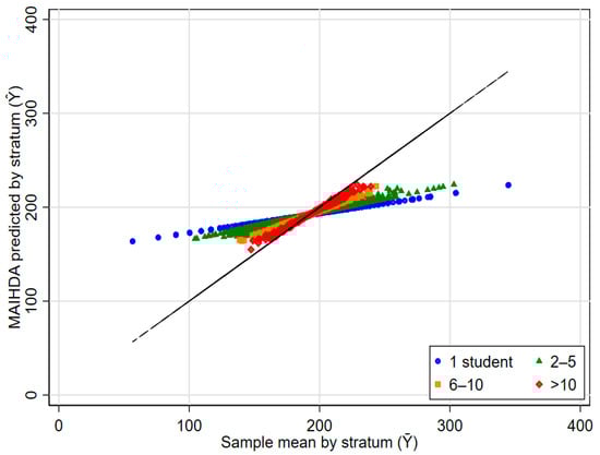 The shrinkage effect of the Empirical Bayes method is illustrated in Figure 3, which compares the MAIHDA-predicted stratum means from Model 1, namely , with the sample stratum averages. Strata with very few students show strong shrinkage towards the overall mean, whereas strata with larger sample sizes lie closer to the bisector line, indicating minimal shrinkage. This pattern highlights how MAIHDA stabilises estimates for small strata while preserving information from larger ones, demonstrating the benefit of partial pooling over simple stratum averages.