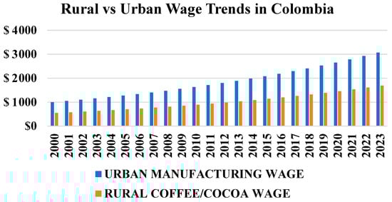 This research provides the first comprehensive analysis of the rural–urban wage gap in Colombia, with a focus on the coffee and cocoa sectors in Colombia in these sectors over two decades. Our analysis confirms that a large and persistent wage disparity exists; rural workers in these traditional agricultural sectors earn, on average, about half of what urban manufacturing workers earn. Even after accounting for differences in education and experience, a substantial wage penalty remains for being a rural worker, highlighting deep structural issues. We found little evidence of market-driven convergence between rural and urban wages over the past two decades; the gap has neither systematically narrowed nor closed. This enduring disparity is rooted in Colombia’s dual economic structure, where a low-productivity, labor-abundant rural sector coexists with a more productive, protected urban sector.