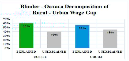 Figure 2 presents the Blinder–Oaxaca decomposition of the mean wage gap (placeholder for an embedded table). We performed the decomposition for the coffee vs. urban gap and the cocoa vs. urban gap. In both cases, we included education, age (experience), gender, and job informality as the key covariates. The decomposition yields two main components: “explained” (due to endowment differences) and “unexplained” (due to different returns or residual factors).