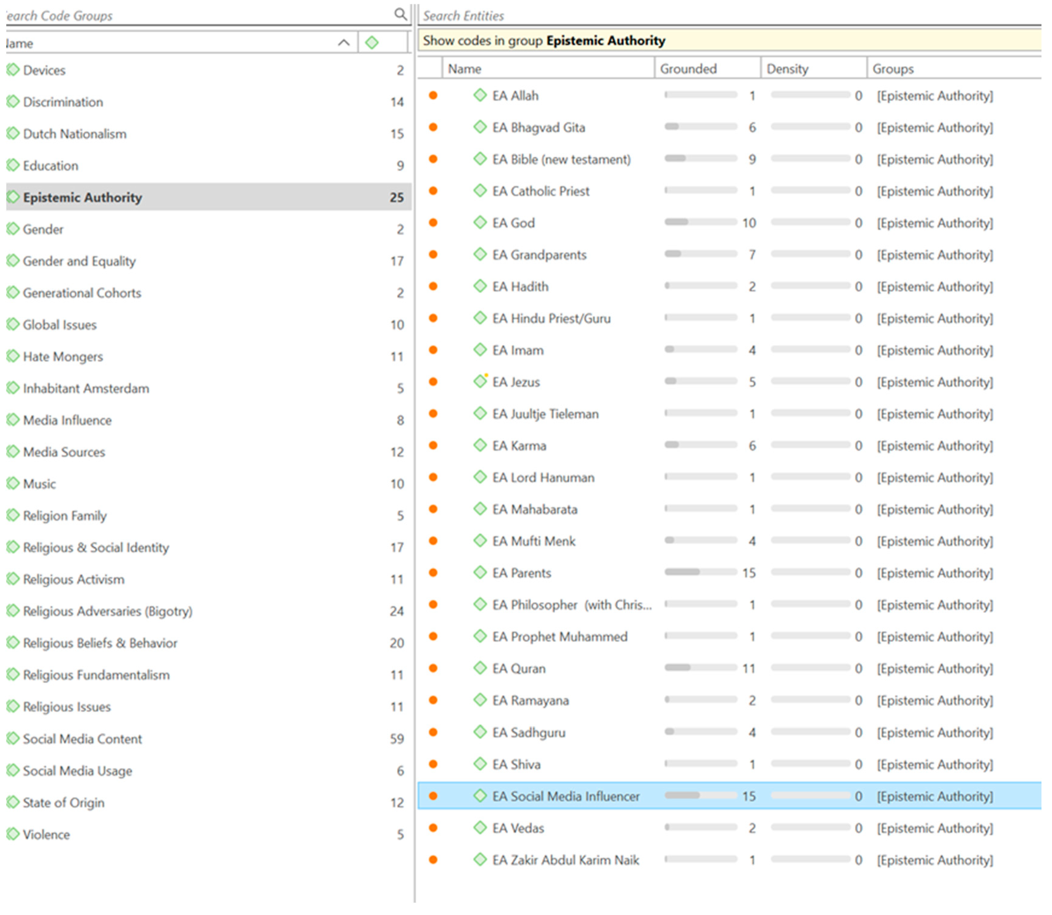 Figure 1 shows a screenshot of qualitative research coding software, displaying different code groups and entities under the category “Epistemic Authority.” On the left panel, various code groups are listed, such as “Devices,” “Discrimination,” “Dutch Nationalism,” and “Epistemic Authority,” with numbers beside them indicating the number of coded references. For example, “Epistemic Authority” has 25 coded references. The right panel focuses on codes within the “Epistemic Authority” group, listing specific entities like “EA Allah,” “EA Bhagvad Gita,” “EA Bible (New Testament),” “EA Catholic Priest,” and more. Each entity has two columns beside it: “Grounded” (the number of times the entity is referenced in the data) and “Density” (a visual bar, though no values are shown in the density column).