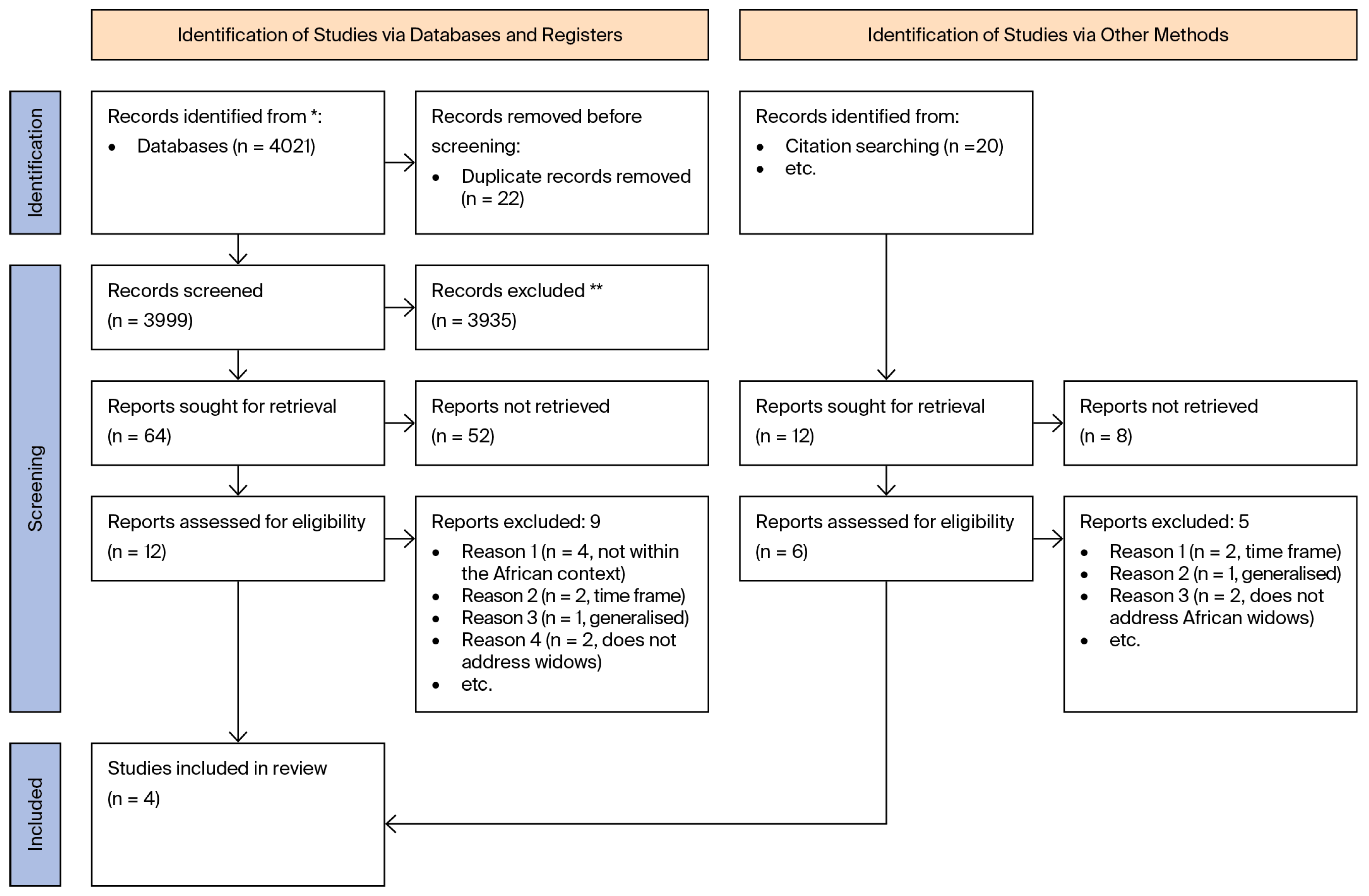 Horsley et al. 2011), and studies that reported the psychosocial challenges of African widows in low-resourced communities during the COVID-19 pandemic and which met the inclusion criteria were retrieved.