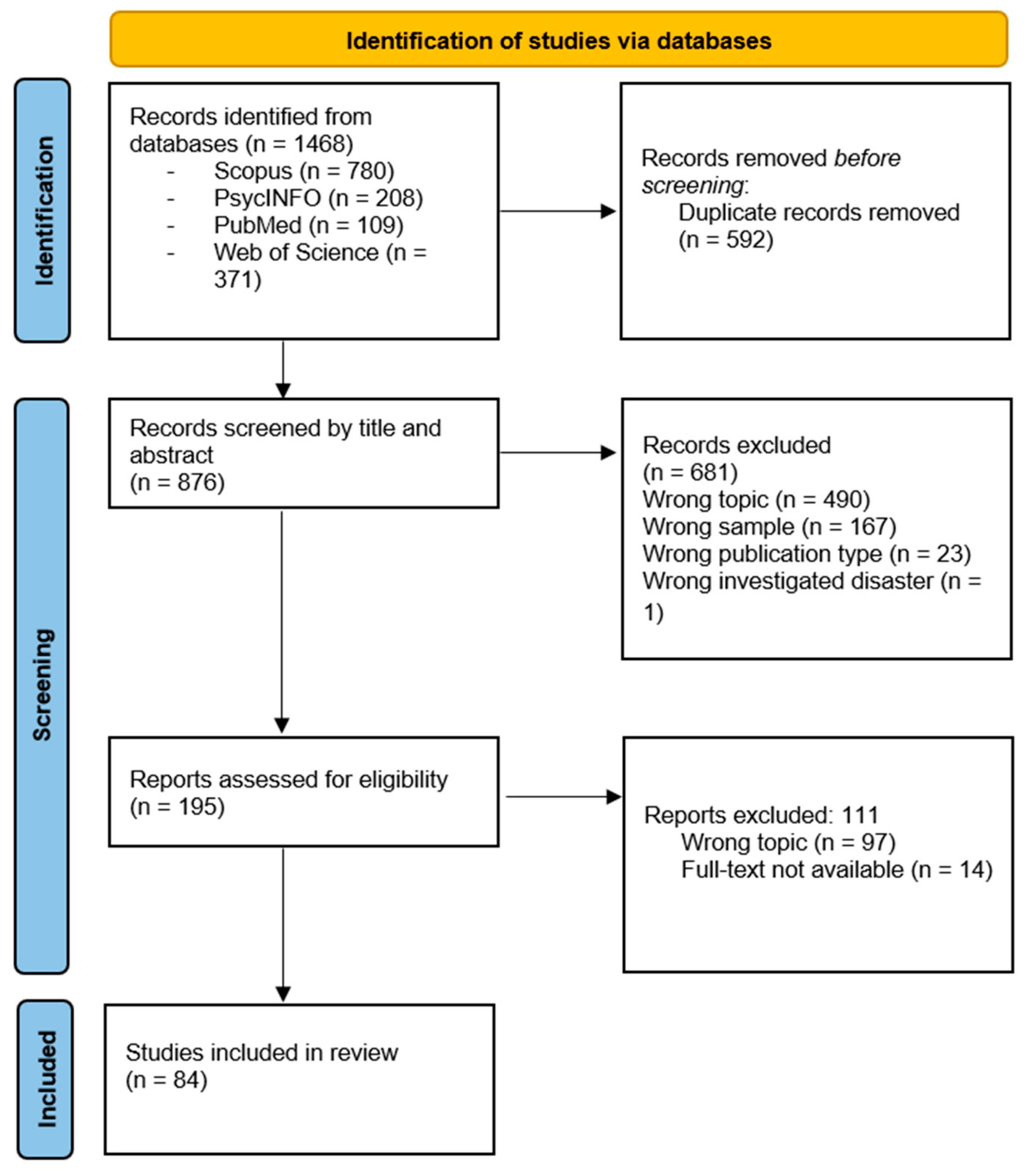 | Level of Exposure to Disaster/Community | Saito et al. (2022), Nagamine et al. (2020), Wang et al. (2016), Hugelius et al. (2017), Kang et al. (2015), Heavey et al. (2015), Gonzalez et al. (2019), Wang et al. (2011), Wang et al. (2013), Thormar et al. (2012), Kang et al. (2015), Fullerton et al. (2013), Shepherd et al. (2017), Soffer et al. (2011), Lambert and Lawson (2013), Ren et al. (2018), Zachariah et al. (2023), Thormar et al. (2016), Cetin et al. (2005), Ma et al. (2020), Hsiao et al. (2019), Surgenor et al. (2015), Huang et al. (2013), Bekircan et al. (2024), Bronisch et al. (2006), and Krishna and Damle (2017). |