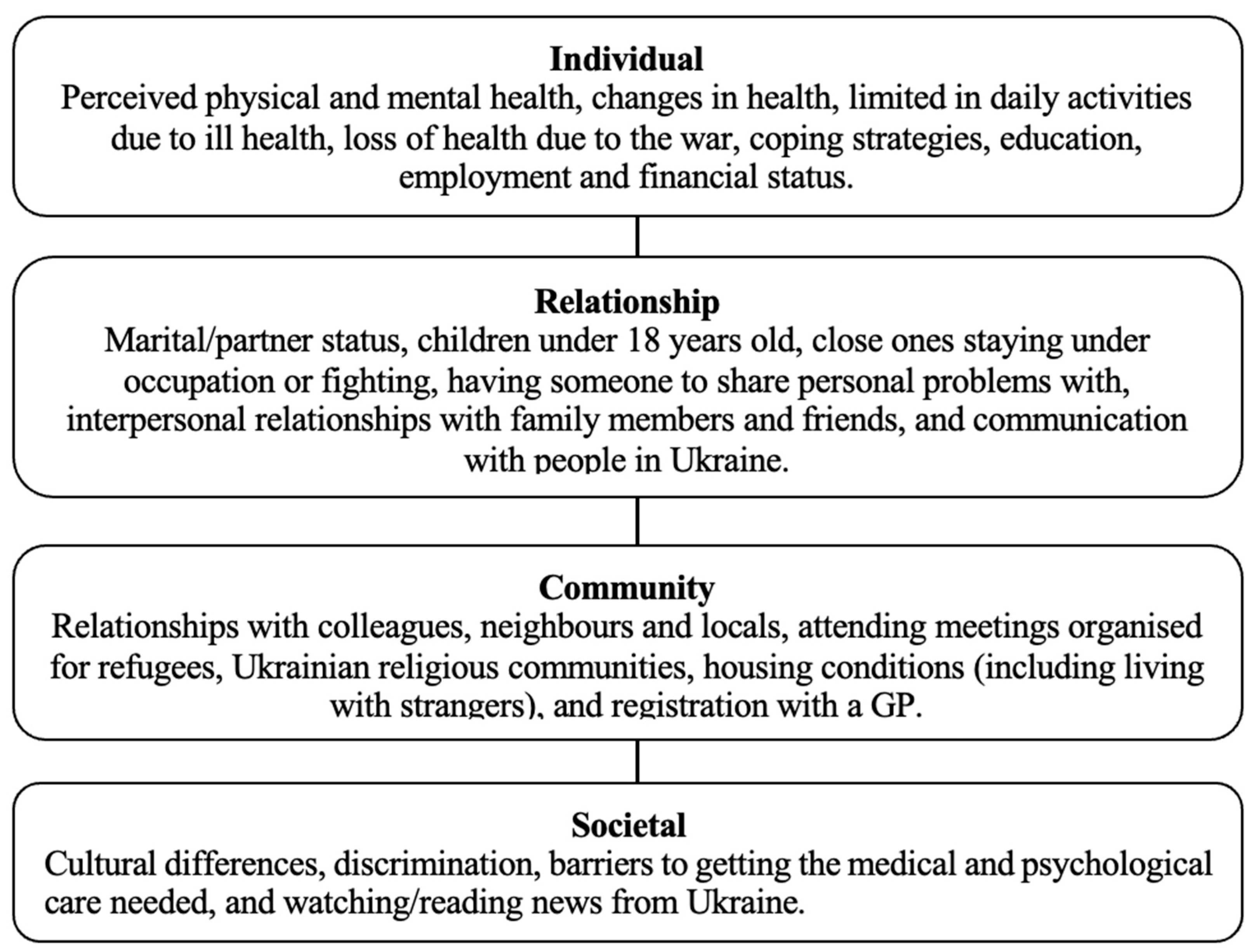 The current study examined factors influencing perceived mental health among Ukrainian female refugees using the socio-ecological model, which offers a comprehensive, multi-level framework for understanding mental health outcomes among forced migrants by analysing connected levels of influence: individual factors, interpersonal relationships and social support, community contexts, and broader societal levels. The findings emphasise the multi-layered nature of mental health among Ukrainian women in displaced populations.