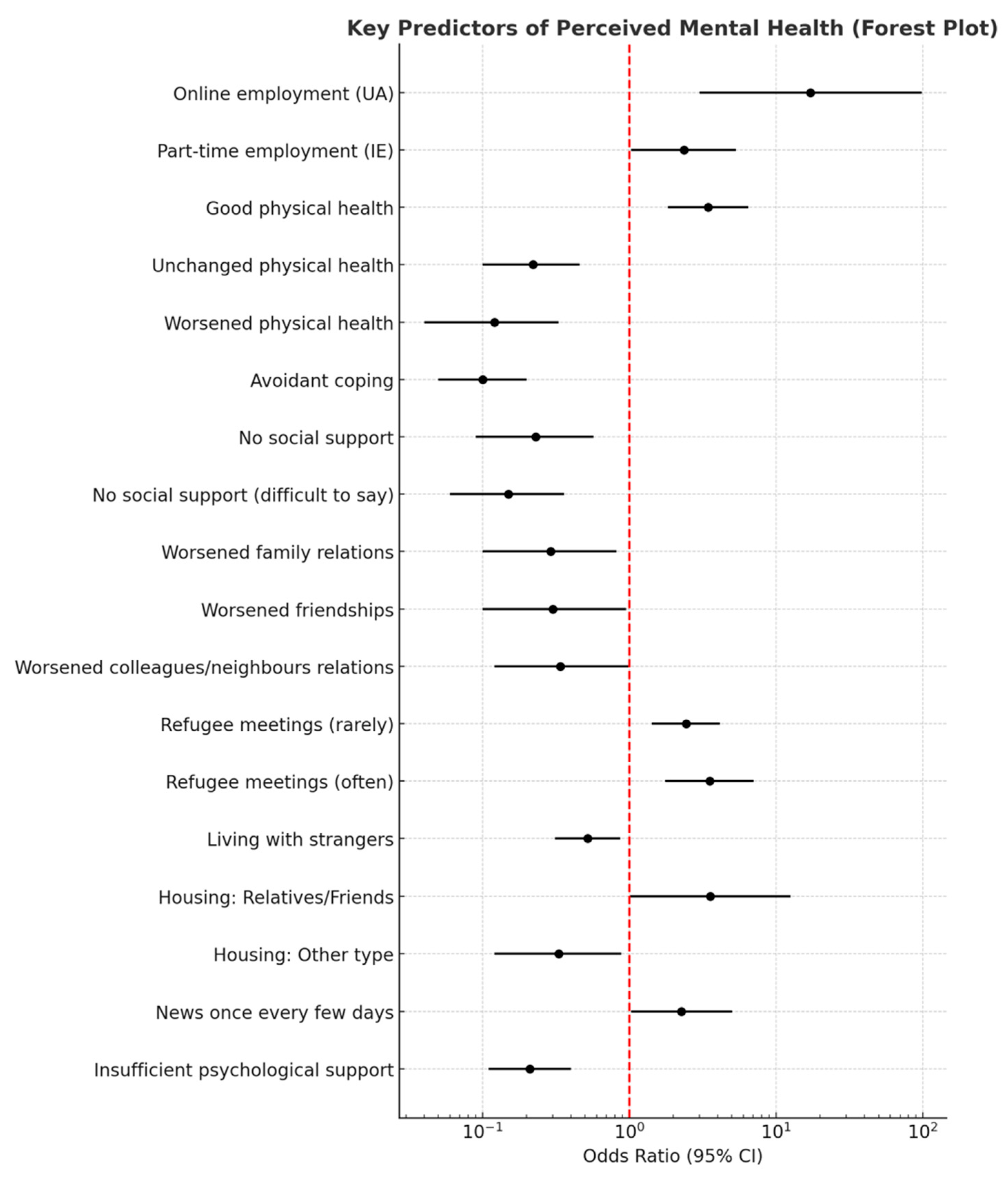 Communication patterns also mattered. Communicating with people in Ukraine once every few days was associated with higher odds of perceived good mental health compared to having multiple contacts daily (OR = 2.12, p < 0.05). All other communication frequencies—once per day, once per week, once per several weeks, having no possibility, or having no desire to communicate—were not significantly associated with perceived mental health. This pattern suggests that moderate communication may offer emotional connection and support without the heightened stress that can accompany frequent updates about the war in Ukraine.