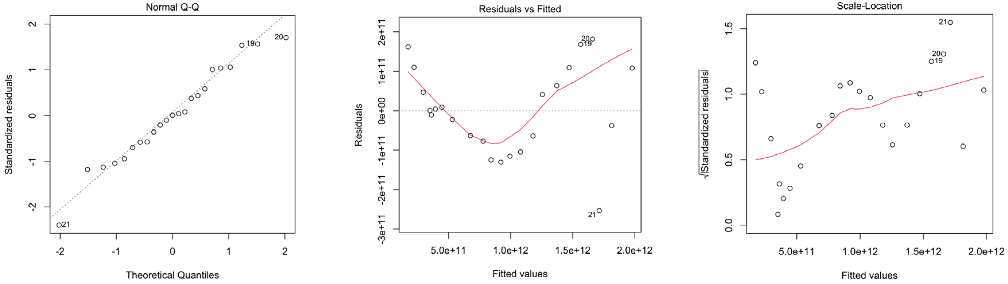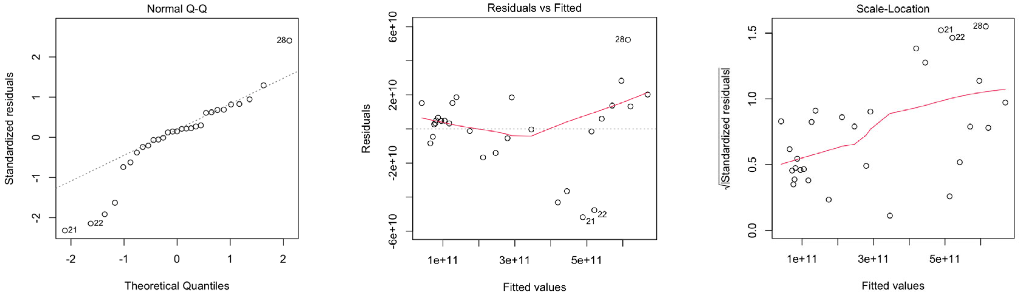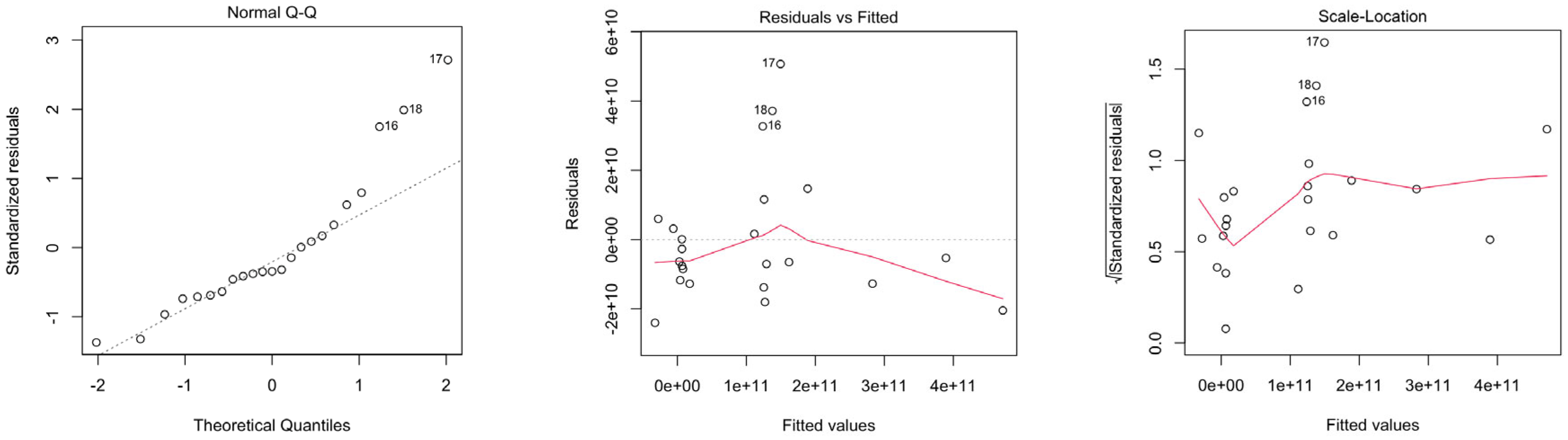 | −5.232 × 107 | 1.447 × 107 | −3.617 | 0.00121 | 0.3015 | |