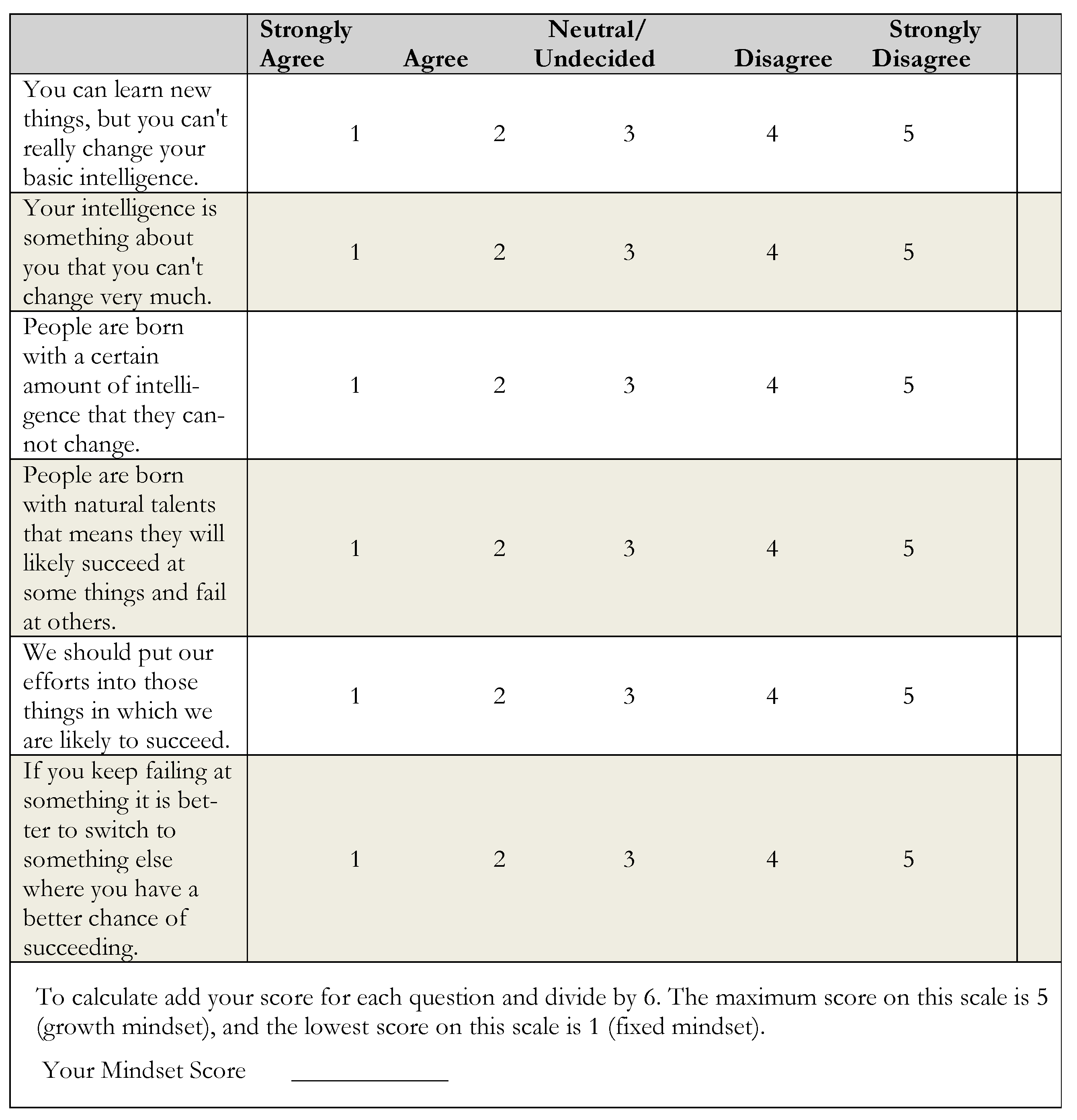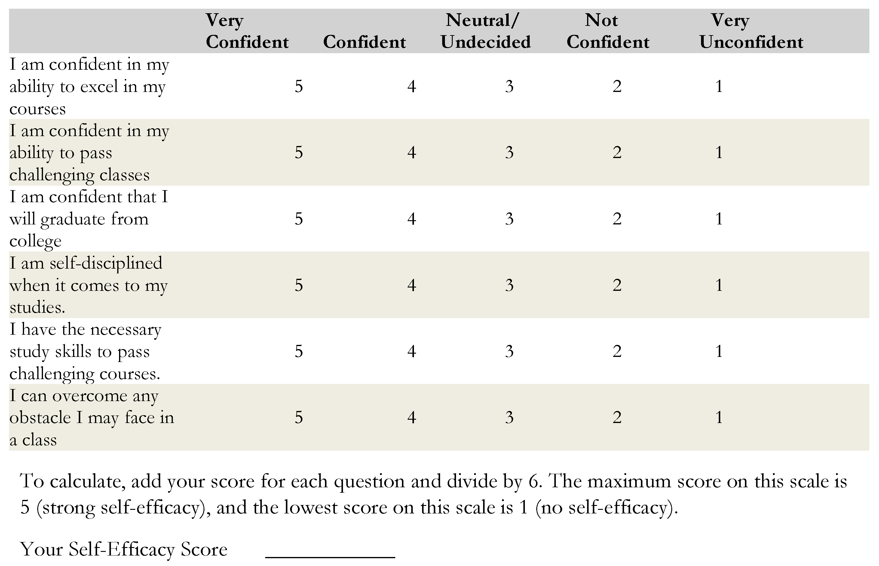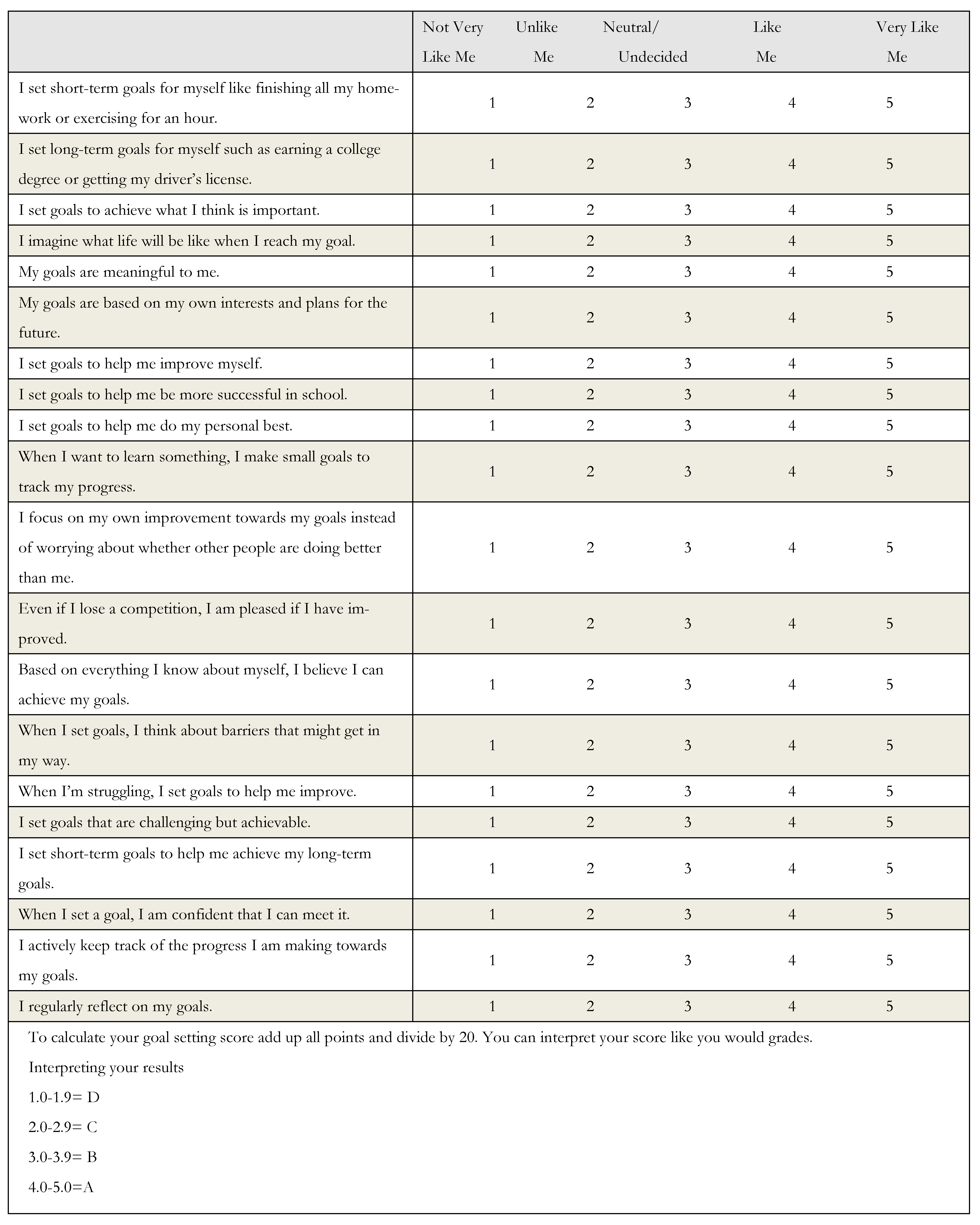 | Category | Self-Efficacy | Growth Mindset | Goal Setting |