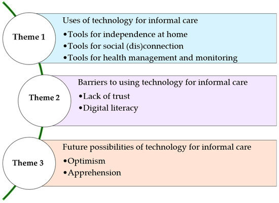 Three themes were identified across the playshops with older adults in regard to informal caregiving and technology, as illustrated in Figure 1.