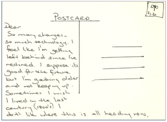 Digital tools are seen as a double-edged sword for social interaction. While they enable video calls, social media use, and connection with family, over-reliance on them was perceived as creating risks of social isolation. Balancing technology with meaningful face-to-face interactions was often highlighted in the postcards to participants’ current self. Sandra wrote: “Dear current self, Stay in contact with people, invite them home, go out. Protect your eyes from too much screen time—go into the garden. Enjoy life!” Despite these concerns, using mobile media to speak to family members and stay connected were perceived as some of technology’s most important uses.