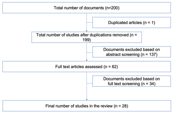 Thirdly, the full text of the 62 selected articles was analyzed. Articles for which full-text access could not be obtained were excluded, as well as those that, upon in-depth review, were found not to meet the inclusion criteria of this study or failed to address the research question. As a result, 34 articles were excluded, 19 of them due to not being available in the authors’ universities’ database, and 15 of them because they did not fit the inclusion criteria. Thus, 28 articles were selected for analysis (Figure 1).