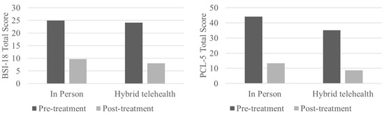 Pre- and post-treatment psychological distress and traumatic stress symptoms. Similar declines in symptoms were found for both in-person and hybrid telehealth group formats.