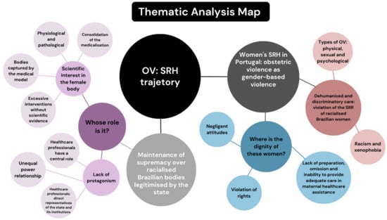 The results presented in this study confirm that unnecessary obstetric interventions are frequently carried out in various hospitals and health centres in Portugal, alongside physical, sexual, psychological, and institutional violence, lack of autonomy and rights, unequal power relationships, discrimination, barriers, and stereotyping (; , ; ; ; ; , ). Combating the countless violent and traumatic acts that affect the majority of women is a driving force behind this research, and an aggravating factor is the issue of immigration—a situation for which the scientific literature is still scarce and women’s issues more invisible, particularly racialised Brazilian women living in Portugal, who are faced with a lack of respect for their autonomy, dignity, and rights during pregnancy, childbirth, and the postpartum period.
