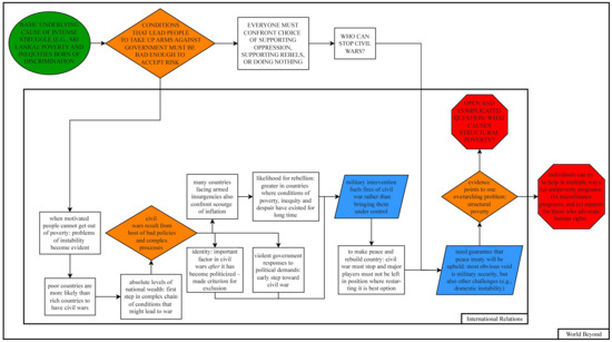 Figure 2. The diagram begins in the World Beyond the academic study of IR. Although by definition, civil wars are armed conflicts involving actors within the state, these armed conflicts occur within the bounds of that international system. Civil wars tend to transcend borders bringing clear and evident threats to international peace and security, as per the green oval in the World Beyond. In doing so, much attention in the field of international relations has been paid to understanding how to best manage, and ultimately, resolve such disputes.