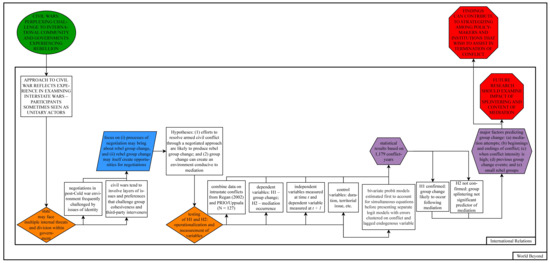 2002) combined with the Armed Conflict Database (UCDP/PRIO). Important steps to the statistical analysis, based on 1179 conflict years, are presented in the nodal component that appears as a purple hexagon in the figure. The dependent variables examined were rebel group change and mediation occurrence, with each measured at time