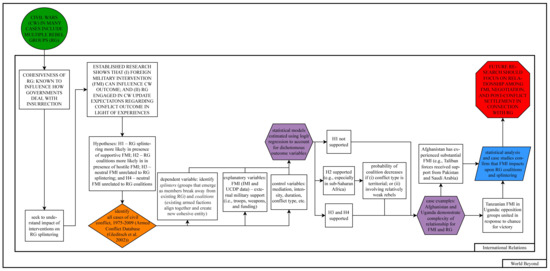 Findings relating to interventions and rebel group dynamics were based on multivariate logit regression due to of the dichotomous nature of the outcome variable, as per the nodal component depicted as a purple hexagon in