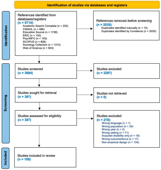Authors RS and RA conducted searches of articles published from 2018 to 2023 in the following databases: Sociology Collection, CINAHL, PsycInfo, Web of Science, SCOPUS, Education Source, Academic Search Complete, and ERIC. These databases were selected for their relevance to social sciences, interdisciplinary research, and studies examining employment, disability, and workplace equity (Beaudry and Miller 2016; Hughes and Sharp 2021), and articles from before 2018 were not considered to ensure the inclusion of recent and relevant findings reflecting contemporary workplace policies and practices (Bramer et al. 2017). A total of 5714 articles were retrieved. After exporting to an online data management system (Covidence), 2030 duplicate articles were removed, yielding 3684 articles for title and abstract screening.