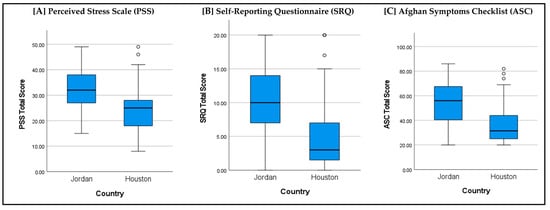 Psychological measure scores of Houston-based versus Jordan-based Syrian refugee women. (A) Perceived Stress Scale (PSS), (B) Self-Reporting Questionnaire (SRQ), (C) Afghan Symptoms Checklist. Means are represented by lines, and whiskers represent minimum and maximum values.