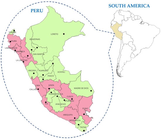 - Geogpsperu. 2024. Mapa Distritos del Perú. Available online: https://www.geogpsperu.com (accessed on 10 June 2024).