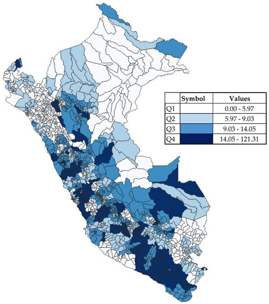 - For all districts and for each interquartile interval, sociodemographic indicators and indices were calculated based on the official statistical records of the Peruvian Government. On the one hand, those referring to the volume of the total population, the demographic density (inhabitants/km2), the ratio of rural population to the total defined as the population residing in settlements with fewer than 2000 inhabitants, the average age of the total population of the district, the number of adult elderly women of childbearing age aged between 15 and 49 years, total adolescent women and adolescent women with children aged between 12 and 19 years, the population over 60 years of age and the average age of the total population; and, on the other hand, indicators referring to the number of illiterate people with respect to the total population and the indicators of monetary poverty expressed in the ratio of the population that does not have basic subsistence resources.