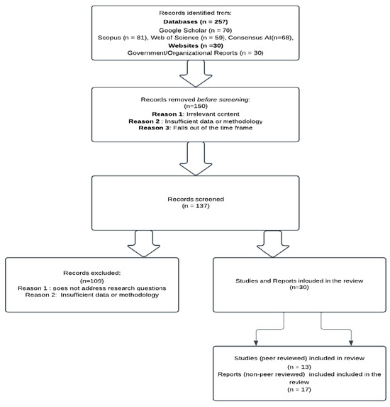 The retrieved studies and reports were organized chronologically by year of publication and then alphabetically by the surname of the first author. Each distinct study was thus uniquely coded to allow thematic content analysis through Bardin’s strategies and procedures, ensuring systematic review. A total of 287 records were identified from Google Scholar (n = 70), Scopus (n = 81), Web of Science (n = 59), and Consensus AI (n = 68). Some records were also acquired from government and organizational reports (n = 30).