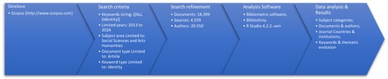 This flow chart illustrates the bibliometric research process conducted to analyze the concept of “identity” using Scopus as the primary database. The initial stage involves setting the search criteria, which includes using the keyword string ((ALL (Identity))), limiting the publication years to 2013–2024, restricting the subject area to Social Sciences and Arts and Humanities, and focusing on articles with “identity” as the primary keyword. The second stage involves refining the search results, which yielded 18,399 documents from 4559 sources and involved contributions from 29,550 authors. The analysis stage utilizes bibliometric tools, specifically Biblioshiny and R Studio (version 4.2.2), to process and visualize the data. The final stage focuses on data analysis and results, exploring various dimensions such as subject categories, document and author distributions, journal countries and institutions, and the thematic evolution of keywords. This systematic approach ensures a comprehensive exploration of the topic within the specified parameters, providing robust insights for academic discourse.