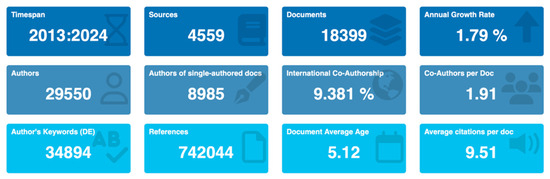 Main Information. This image summarizes key bibliometric information from 2013 to 2024, including 18,399 documents, 29,550 authors, and an international co-authorship rate of 9.38%. It shows an average of 1.91 co-authors per document, with an annual growth rate of 1.79% and an average of 9.51 citations per document.