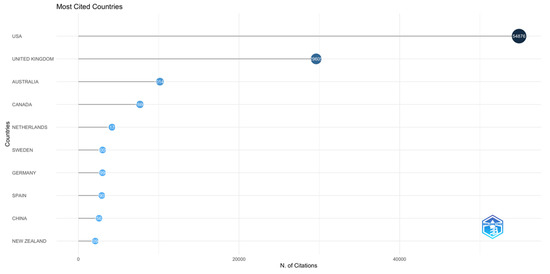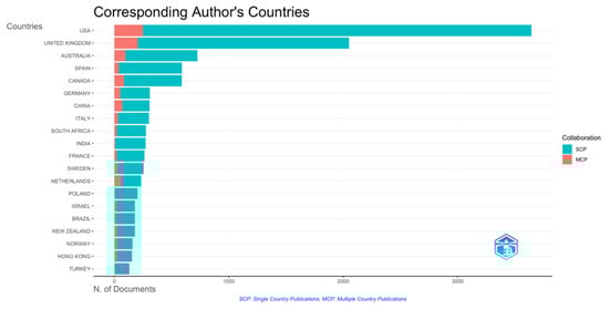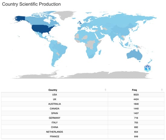 Figure 3 shows that the global landscape of identity research, as reflected in the Country Scientific Production dataset, highlights the disproportionate contributions of a few dominant countries. The United States (USA) emerges as the most prolific contributor, with 9523 publications, significantly outpacing other nations. This dominance can be attributed to several factors, including the country’s well-established academic institutions, substantial research funding, and extensive international collaborations. The USA’s leadership in social sciences and humanities, alongside its emphasis on interdisciplinary research, likely reinforces its strong publication output in identity studies.