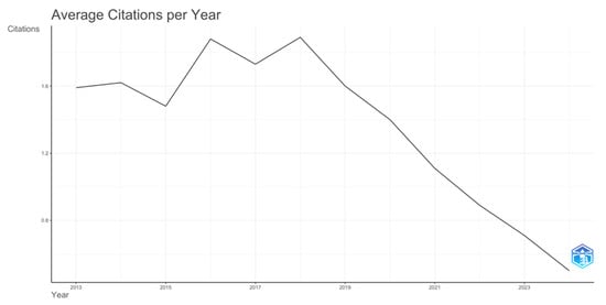 The chart in Figure 4 shows a fluctuating trend in the average number of citations per publication between 2013 and 2024. Initially, from 2013 to 2015, the average number of citations remained relatively stable, hovering around 1.6 citations per document. However, a noticeable increase occurred in 2016, where the citation rate peaked, suggesting that publications from that period gained significant attention and were cited more frequently. After 2016, the trend started to display fluctuations with minor decreases and increases until 2019. From 2019 onward, the average citations per year began to decline sharply. By 2021, this downward trend became more pronounced, showing a significant reduction in the average number of citations, which continued to decrease steadily through to 2024. This downward trend might be attributed to several factors, such as the growing volume of publications, which could dilute the focus on individual works, or the shift in scholarly attention to newer areas of research. Additionally, more recent publications may not yet have had enough time to accumulate significant citations, as citation counts tend to grow over time. Therefore, the lower averages in recent years might reflect the temporal nature of citation accrual rather than a decrease in the impact of recent publications.
