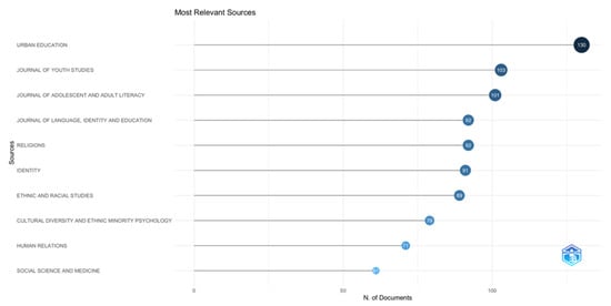 Most Relevant Sources chart. Based on the number of documents published. Urban Education leads with 130 documents, followed by Journal of Youth Studies and Journal of Adolescent and Adult Literacy, with 103 and 101 documents, respectively. Other key sources include Journal of Language, Identity, and Education and Religions, each contributing significantly to the field.
