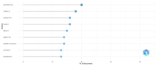Figure 7 shows that Schwartz SJ emerges as a leading author with 20 articles and a fractionalized contribution of 4.41 (see Table 1). This high level of productivity reflects a substantial influence on identity studies, likely spanning multiple areas, including adolescent psychology and developmental identity, as suggested by prior affiliations. Jaspal R ranks second with 18 articles and a remarkable fractionalized contribution of 13.25, emphasizing their prominent role in collaborative research. This suggests a leadership position in identity studies, particularly in the domains of social and cultural identity. Crocetti E and Wang Y have each contributed 16 articles, with fractionalized contributions of 3.60 and 8.67, respectively. Their works likely explore interdisciplinary aspects of identity, engaging with collaborative perspectives to address diverse research questions. Other notable contributors include Meca A, Sibley CG, Umaña-Taylor AJ, Luyckx K, and Sugimura K, with 13 to 15 articles each. Their consistent involvement demonstrates specialization within subfields of identity research, further enriching the discourse in this area.