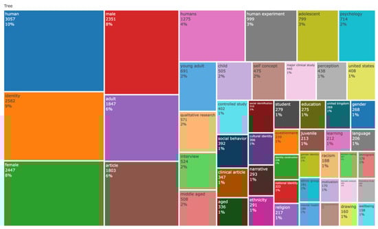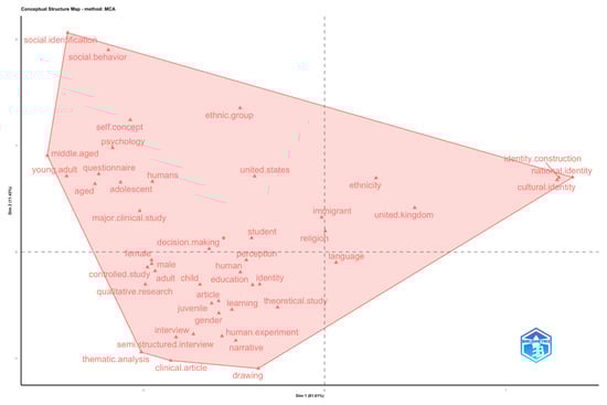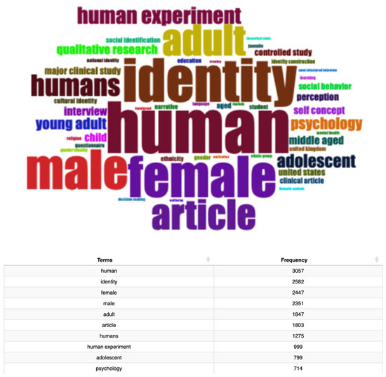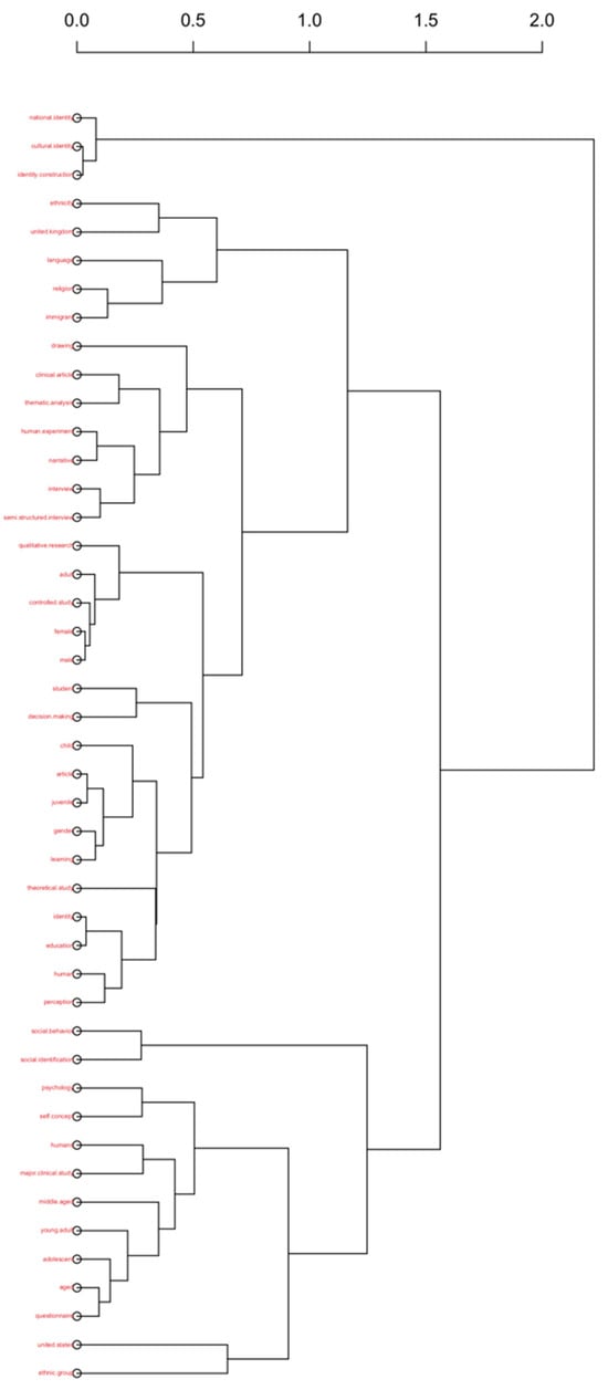 The emphasis on terms like “ethnicity”, “cultural identity”, and “national identity” across both the Conceptual Structure Map (Figure 15) and Dendrogram (Figure 16) highlights a significant body of research that focuses on identity as a socially constructed phenomenon. Studies in this area often engage with questions of belonging, exclusion, and power, particularly in the context of race, migration, and cultural integration. The prominence of terms like “immigrant” and “language” suggests that scholars are particularly interested in how identities are negotiated in multilingual and multicultural environments, where individuals must reconcile multiple, often conflicting, identities. The terms clustered under psychological and behavioral dynamics, around “self-concept” and “psychology”, indicate a continued interest in the internal processes of identity formation. This research typically addresses how individuals develop a sense of self and how this evolves across different life stages. The inclusion of terms related to behavior (“social behavior”, “decision-making”) suggests that identity research also examines the ways in which identity influences actions and interactions within social contexts. And also, under methodological diversity, the presence of terms like “questionnaire”, “controlled study”, and “narrative” in the Dendrogram underscores the methodological diversity in identity research. Scholars employ a range of research designs, from experimental and controlled studies to qualitative interviews and narrative analyses, indicating that the field is methodologically robust and capable of addressing complex questions about identity from multiple angles.