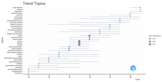 The combined insights reveal that identity research is a rich, interdisciplinary field that spans both sociocultural and psychological dimensions. The map’s clustering of terms highlights the thematic relationships between identity as a social construct and as an individual psychological experience, while the Dendrogram’s hierarchical structure provides a detailed view of how these concepts are organized and interconnected. The field continues to expand its focus, incorporating both traditional and emerging methodologies and engaging with contemporary issues such as migration, national identity, and the psychological effects of identity formation. These visualizations provide a comprehensive overview of the intellectual landscape of identity research, offering a roadmap for scholars to navigate its complexities and uncover new areas of exploration.