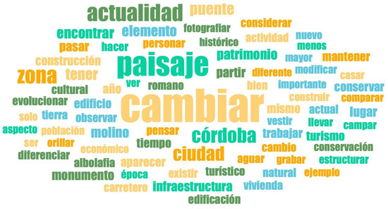 By observing a word frequency analysis of this, we could see a trend that aligned with what was mentioned earlier. In Figure 3, the most frequently used words are “change” and “landscape”, used by 82% and 50.3% of the students, respectively. This aligns perfectly with the majority of participants who mostly agreed in noting changes—to a greater or lesser extent—in the landscape. This same figure indicates a high frequency of words related to heritage that students used to highlight these changes in the landscape, such as “Córdoba” (27%), “city” (25.4%), “area” (24.9%), or “bridge” (19.6%).