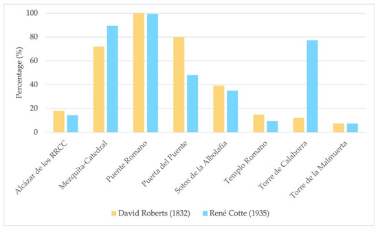 Figure 4 shows that the Puente Romano, present in both images, was the element most identified by the students in both engravings, with a 100% recognition rate. It constitutes a central element in both landscapes, and its identification was straightforward due to the presence of the Guadalquivir River as it flows through the city. Other elements identified in both engravings for their centrality in the landscape were the Puerta del Puente and the Torre de Calahorra (in Roberts’ and Cotte’s engravings, respectively), although at lower percentages than expected as the following: 79.9% of the students recognized it in Roberts’ work and 77.2% in Cotte’s.