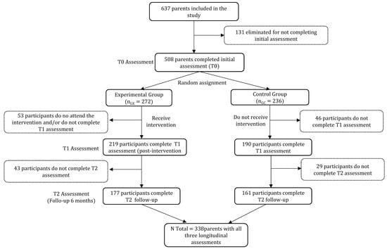 Figure 1 shows a flow chart of the participants. Participants were divided into the Experimental Group (EG) and the Control Group (CG). Concerning the groups, 53.5% of participants were assigned to EG (nEG = 272; 27.98% fathers and 72.02% mothers), and 46.5% were assigned to CG (nCG = 236; 25.78% fathers and 74.22% mothers).