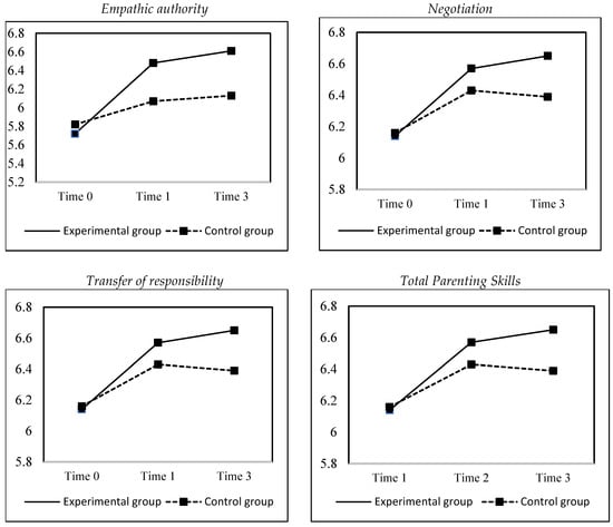 Figure 2 graphically shows the progression in the scores of each variable (empathic authority, negotiation, transfer of responsibility, and total parenting skills, respectively) depending on the group and the time point of evaluation.