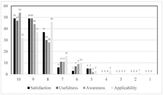 Finally, the EG parents appraised the workshop very positively. On a scoring scale of 1 to 10, we observed that the majority of participants (84.80%) scored around 8, 9, or 10 on the four variables studied: satisfaction, usefulness, awareness, and applicability of the workshop (Figure 3).