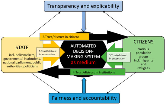 To account for institutional trust, we identified the four dimensions of the institutional trust model in the state–citizen relationship: (1) policymakers’ (dis)trust in automated systems; (2) policymakers’ (dis)trust in citizens; (3) citizens’ (dis)trust in automated systems; and (4) citizens’ (dis)trust in policymakers (including governmental institutions, national parliament, public authorities and politicians).