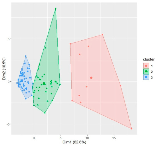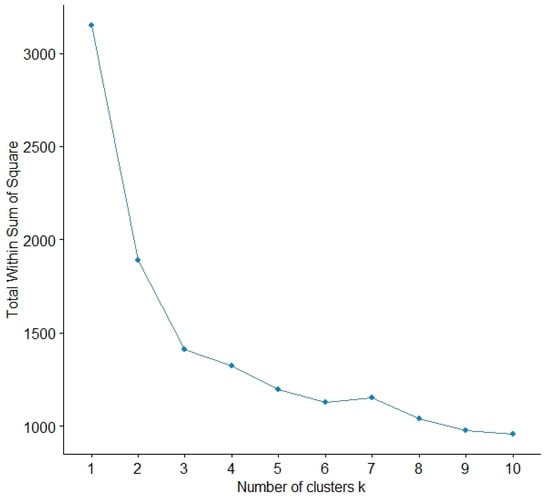 K-means clustering analysis revealed three distinct clusters of students based on their perceptions of WhatsApp use. Each cluster presented unique characteristics that reflect important differences in how students rate the platform’s usefulness and effectiveness for communication and its general application in the academic environment. Cluster 1 (Figure 5, red color) was characterized by containing students with the least favorable perceptions about WhatsApp use. The average scores on the variables related to usefulness for communication with peers and group work were 2.7 and 2.6, respectively, indicating that these students do not perceive WhatsApp as a particularly useful tool in the educational context. The total means of perception in the different dimensions ranged from 2.5 to 3.1; this group of students might have certain reservations about using the platform in collaborative or educational activities. These students may prefer other methods or tools to carry out such activities.