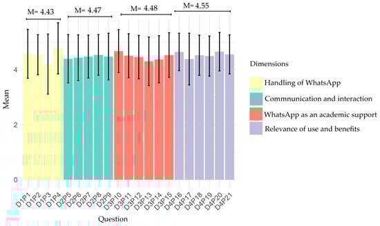In contrast, Dimension 4, which assessed the relevance of the application’s use and overall benefit, was the highest rated among the dimensions (Figure 2), with a mean of 4.55 (SD = 0.65). Students view WhatsApp as an innovative (D4P18: M = 4.53) and practical resource for learning (D4P19), mainly highlighting the benefit of integrating WhatsApp in general in education (D5p16: M = 4.65 ± 0.70) and the recommendation of its use for other subjects (M = 4.66).