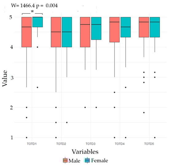 Likewise, the results of the Mann–Whitney and Kruskal–Wallis tests revealed significant differences in students’ perceptions of WhatsApp use based on two dimensions, with values below their significance value (p < 0.05). The subject that students are enrolled in significantly influences their perception of WhatsApp management (Dimension 1) and its general use (Dimension 4) (p < 0.018 for Dimension 1 and p < 0.027 for Dimension 4), with those in Knowledge Management being those who rated the dimensions best. Regarding sex, a significant difference was determined in Dimension 1 (W = 1591.5, p- value = 0.036), where women obtained a higher rating (M = 5.00) (Figure 4), unlike men, whose average value reached 4.67.