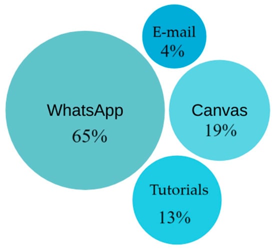 Finally, most students prefer WhatsApp as their main means of communication with teachers, over tools such as the academic platform Canvas, face-to-face tutoring, and email. This finding reflects a clear trend towards the use of instant messaging in educational environments, especially in the context of distance education, where maintaining close and agile interaction is essential. As Misaghi et al. (2021) point out, WhatsApp, being a technology that allows both synchronous and asynchronous connection, and that facilitates mobile use, offers real-time communication, which allows queries to be resolved quickly and encourages continuous interaction.